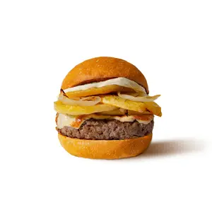 Doppio hamburger da 100gr. cottura smashed, formaggio Gouda, cipolle infarinate e fritte, salsa barbecue, salsa segreta