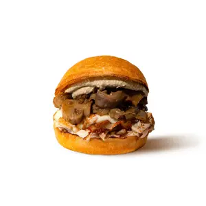Porchetta artigianale, provola affumicata, funghi freschi cotti al forno, crema di funghi homemade, maionese al pomodoro
