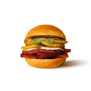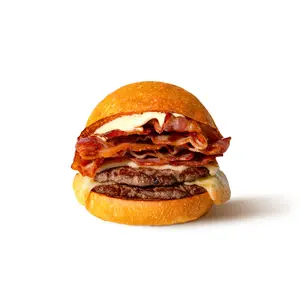 Doppio hamburger della casa da 100 gr. l'uno, formaggio emmental fuso, doppio bacon croccante, salsa segretissima