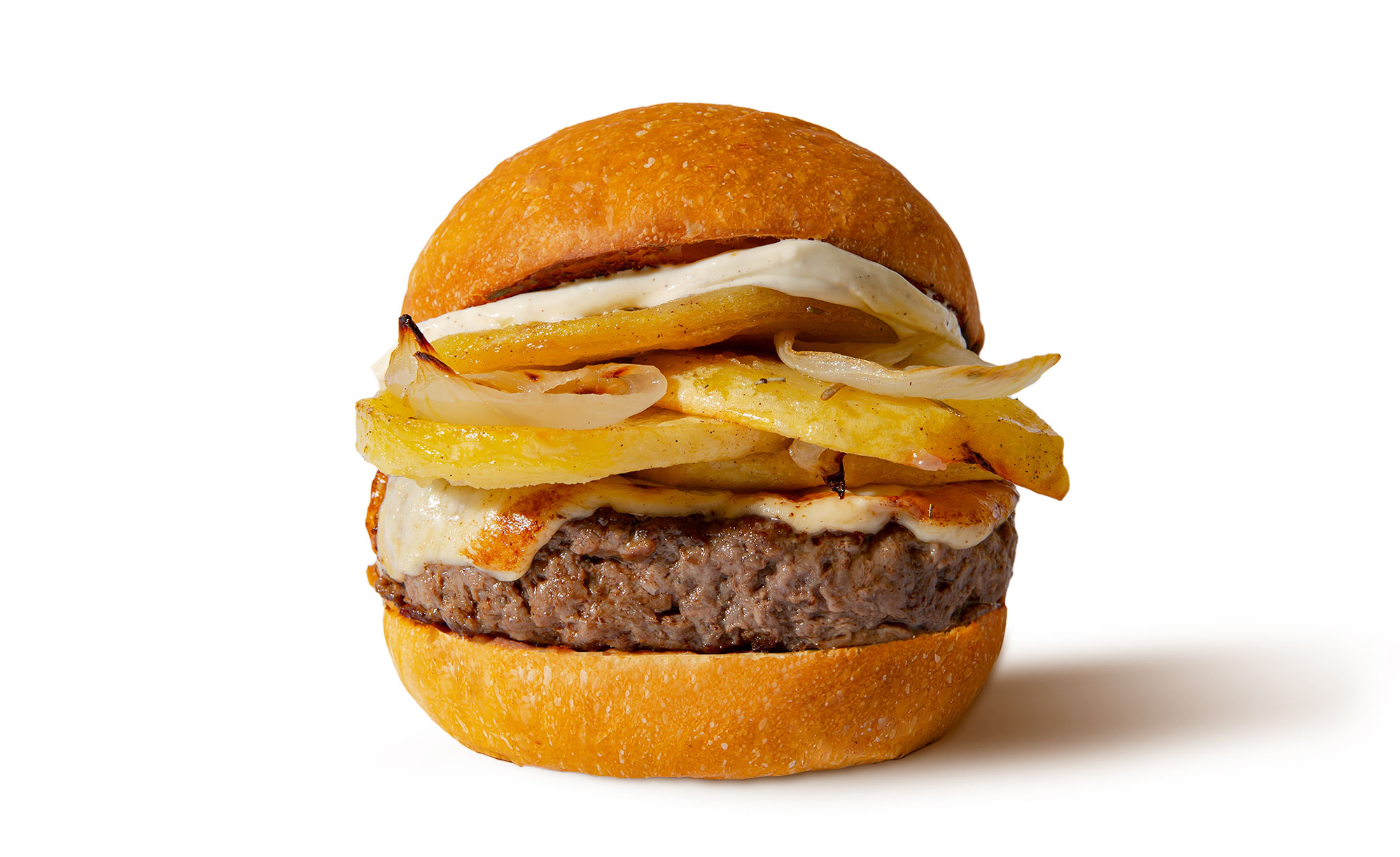 Hamburger della casa 200 gr., patate al forno con cipolla, provola affumicata, maionese al pepe
