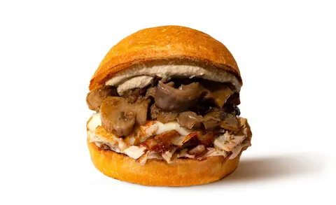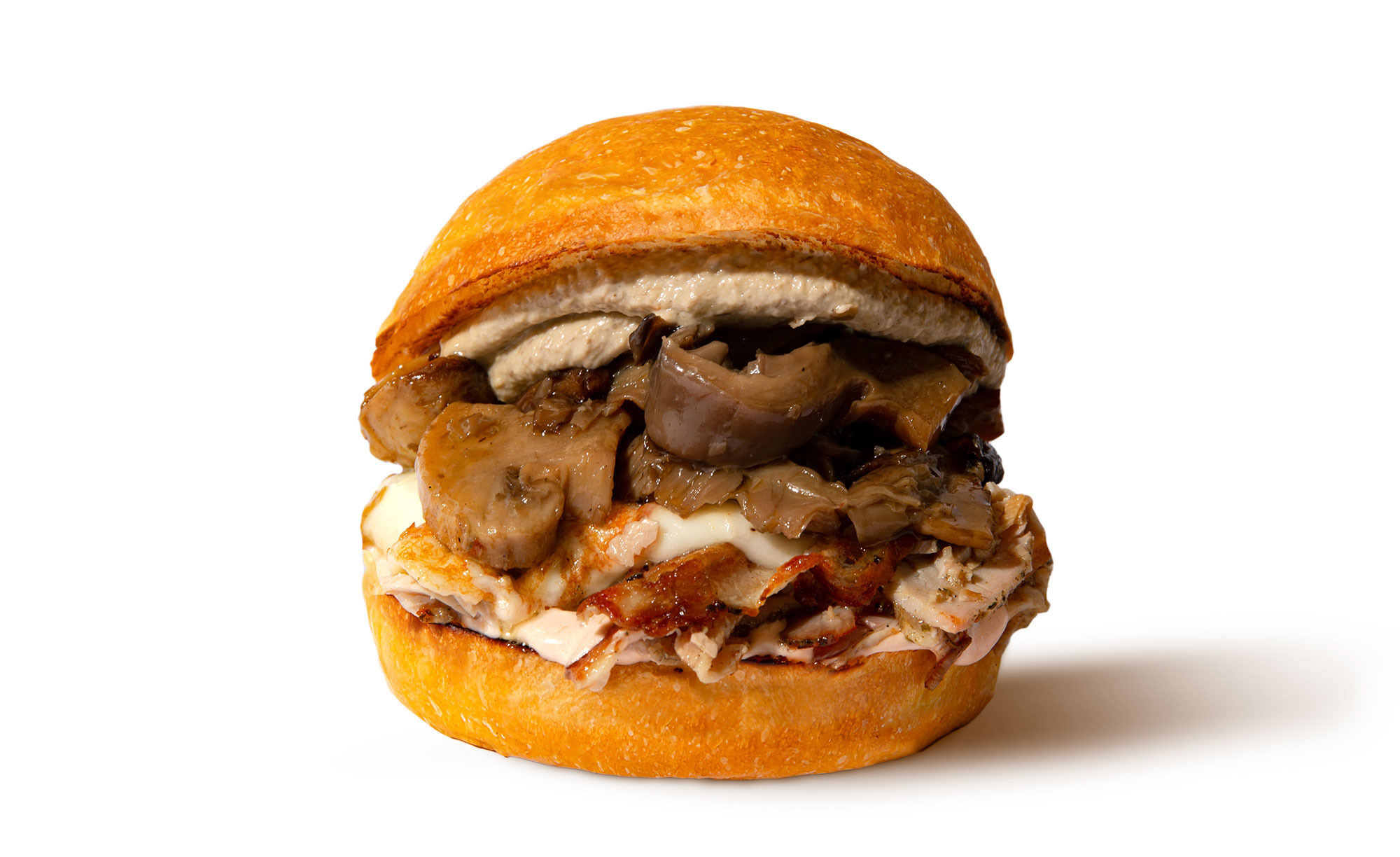 Porchetta artigianale, provola affumicata, funghi freschi cotti al forno, crema di funghi homemade, maionese al pomodoro