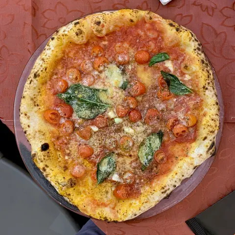 Passata di pomodoro, pomodoro datterino, pecorino romano D.O.P, aglio, origano, pepe e basilico
