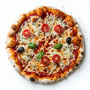 Pomodoro San Marzano, fior di latte, salame napoletano, prosciutto cotto, funghi, carciofi, olive nere, Parmigiano Reggiano 24 mesi, basilico, olio EVO